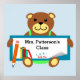 Customize this personalized classroom poster of a teddy bear holding white banner with teacher's name and pencil and books in foreground. Will brighten up any elementary school class. Background color can be changed too.