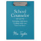 A clean and modern clipboard made just for school counselors. Featuring a minimalist layout on a calming deep teal background, this design highlights the title "School Counselor" in a stylish script font, with space to personalize your own message or quote underneath, plus your name at the bottom for a professional touch. Perfect for everyday use or as a thoughtful gift during Appreciation Week, graduation, or the back-to-school season.