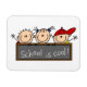 Three stick figure kids with big smiles and a school writing board that reads "School is Cool!" on back to school Tshirts, mugs, cards, stickers, buttons, and more that can be customized.