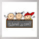 Three stick figure kids with big smiles and a school writing board that reads "School is Cool!" on back to school Tshirts, mugs, cards, stickers, buttons, and more that can be customized.