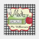 A magnet for a school media specialist featuring an illustration of a computer mouse, a green book, and an apple. Design reads "Media Specialist" and is surrounded by a red frame. Gray gingham background. Personalize with your name under design.