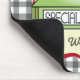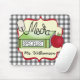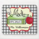 A mousepad for a school media specialist featuring an illustration of a computer mouse, a green book, and an apple. Design reads "Media Specialist" and is surrounded by a red frame. Gray gingham background. Personalize with your name under design