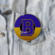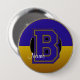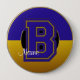 School Colors Monogrammed Button, Blue and Gold, Letter B- A large round four inch pin backed button with a stitched monogram letter in the center. The background of this button is created in two school colors (blue and gold) with a center hole cutout exposing a black background underneath. The round frame is trimmed out at the center and outer edges with a nice gold rim. In the center is a large alphabet letter trimmed in gold stitching. There is a text area already in place for you to personalize as you like. You may write a first name, last name; school name or anything else you like. You may also opt to delete the text area if you prefer. Personalize this school colors button to suit. This collegiate monogram button is available in assorted school colors.