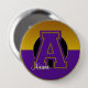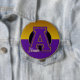 School Colors Monogrammed Button, Purple & Gold, Letter A- A large round four inch pin backed button with a stitched monogram letter in the center. The background of this button is created in two school colors (purple and gold) with a center hole cutout exposing a black background underneath. The round frame is trimmed out at the center and outer edges with a nice gold rim. In the center is a large alphabet letter trimmed out in gold stitching. There is a text area already in place for you to personalize as you like. You may write a first name, last name; school name or anything else you like. You may also opt to delete the text area if you prefer. Personalize this school colors button to suit. The school colors collection comes in a variety of colors.