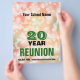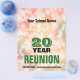 Fully customizable school reunion flyer with festive celebration party lights photo background and editable text. Change school name, year, and contact info, change or add any other text or images you like. Change text color to your school colors if desired.