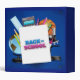 A square-shaped image with a blue border features a vibrant and educational-themed design. In the center, a white square with the words "BACK to SCHOOL" in a playful, layered font. "BACK to" is in blue, while "SCHOOL" is in pink. The square is surrounded by various school-related items. To the left, there's a globe with a light blue ocean and brown continents, along with a ruler and two pencils, one yellow and one green. A calculator is positioned above the globe. To the right, there's a basketball, crayons in purple and green, and a microscope. The background is a gradient of blue, with lighter shades near the center and darker shades towards the edges.