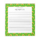 School supplies with small colorful rainbow hearts pattern on green background notepad. The school pattern includes a curved ruler and a yellow school pencil around a red apple. Cute school pattern design for teachers, school counselors, and paraprofessionals. Unique school pattern for teacher Christmas gifts or end of the year gifts. Personalize the notepad with a name.