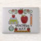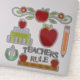 All purpose school teacher themed sticker set sheet with graphics of red apples, stacked books, pencil, ruler and education symbol. Black graphic text, with the ruler, reads Teachers Rule.