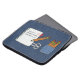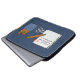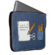 Both useful and very cool, this sturdy laptop sleeve is adorned w/an original design depicting: several taxi yellow pencils (3 of which emerge from a riveted blue jean pocket) ; a red plastic clipped sheet of wide rule paper featuring 3 custom text fields to personalize; a pair of faux metal scissors; on a stone-washed blue denim background.