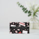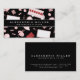 Modern business card features a stylish black and white school pattern with blush pink accounts. A fun and whimsical girly pattern of school buses, pens, pencils, chalkboards, apples and school supplies with custom name and title or role presented on a black banner with white text and accents. The back of the card is plain and simple with coordinating white text on a plain black background.
