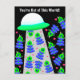 Colorful and fun postcard valentine perfect for grade school or a friend. Multiple aliens and hearts floating down from a spaceship. "You're Out of This World!" "Happy Valentine's Day" on the back.