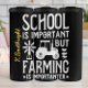 This graphic features a humorous quote presented in bold, white block letters on a solid black background. The text reads "SCHOOL IS IMPORTANT" at the top. Below it, a silhouette of a tractor is flanked by a windmill on the left and a stalk of wheat on the right, with the word "BUT" next to the tractor. The final line states "FARMING IS IMPORTANTER".