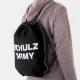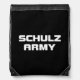 Black Drawstring Backpack with Purple Schulz Army Logo, Inside of Bag is White