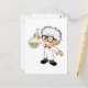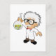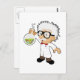 Scientist with glasses holding a beaker with periodic table of elements in posted note form