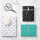 Hair stylist themed wrapping paper sheets featuring three patterns with scissors and combs in different combinations of white, teal, and black.