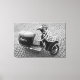 This black and white image of a classic motor scooter parked on cobblestones is the perfect accent to liven up any room. Customize the panel size and proportions to fit your decorative space.