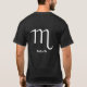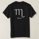 Black background with white writing. Has 2 different symbals for "Scorpio" the word "scorpio" and "loyal" and "October 24 - November 22" on it. personalize with your name. Choose your size style.
