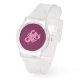 I only have one complaint. I ordered the watch with clear case and strap, and what was sent was white case and strap. I'm going to keep it because 1) it looks very nice in white, and 2) it would take too long to get a replacement made and sent in time for my occasion. Aside from the mix up with the color, the watch does look very good in white. The purple dial is actually sparkly which did not show in the online images. That was a nice surprise. If you like Swatch watches this is very similar to those. It's 33.6mm in diameter, 10.5mm thick, and 40.6mm lug to lug. Stainless steel case back says 3ATM/30m WR, so no swimming or showering or submerging this one. If you like Woodstock, this is a great choice.