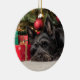 This Christmas ornament features a holiday portrait of a Scottish Terrier resting beneath the Christmas tree, surrounded by softly glowing lights and wrapped presents. With its upright ears and steady gaze, the scene captures the Scottie’s unmistakable presence—calm, confident, and quietly devoted during the most meaningful moments of the season.