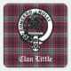 Scottish Clan Little dress tartan plaid pattern with Clan Little crest badge and custom text block in white Old English font