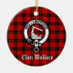 Keepsake ornament features Scottish Clan Wallace tartan plaid background, crest badge and text in Old English style font. Customize with commemorative year or personalized message.