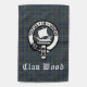 Scottish Clan Wood crest badge on clan tartan plaid pattern background. White Old English style customizable text.