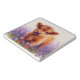 A trivet featuring a watercolor painting of an adorable brown Scottish Highland calf in a field of purple wildflowers. A piece of cute Scottish Highland Cow decor that is perfect for a baby's room decorated in a barnyard style.