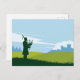 A graphic postcard featuring an illustration of a Scottish landscape with a silhouetted man in a kilt playing bagpipes, standing on a hill in the middle of a green field. The background contains a castle and trees and few clouds in the sky.