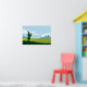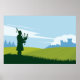 A graphic poster featuring an illustration of a Scottish landscape with a silhouetted man in a kilt playing bagpipes, standing on a hill in the middle of a green field. The background contains a castle and trees and few clouds in the sky. This wall art will be perfect for home or office decoration.
