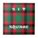 The image features a traditional tartan plaid pattern, a hallmark of Scottish textiles. Superimposed on this rich fabric are the words "SIT" and "SQUARE," arranged vertically. The word "SQUARE" incorporates small cartoonish figures embedded within the letters, adding a whimsical touch. The composition is balanced and focused, emphasizing both the tartan design and the text.