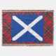 A cool throw blanket for lovers of Scotland and all things Scottish, with a graphic of the Scottish saltire flag with white St Andrew's Cross on dark blue. The background to the Scotland flag is a pattern of the famous Royal Stuart, or Stewart, tartan plaid.