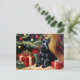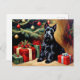 Scottish Terrier by the decorated Christmas tree and festive holiday gifts.