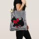 A Scottish Terrier with a big red bow decorates this tote bag. Use this stylish tote bag for work, school, shopping, the beach, travel, etc...