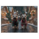 This festive design captures the joyful spirit of the holiday season, featuring an adorable dogs.Nestled in a winter wonderland, complete with a decorated Christmas tree, and beautifully wrapped presents. Snowflakes gently fall, adding a magical touch to the scene, while the vibrant colors of the holiday decorations create a warm and cheerful atmosphere.