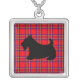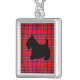 A Scottish terrier dog against a red plaid background gives this necklace retro style. The designs are from original art.
