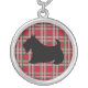 A Scottish terrier dog against a red plaid background gives this necklace retro style. The designs are from original art.