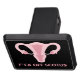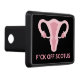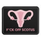 A trailer hitch cover with a message to the Supreme Court of the United States and the overturning of Roe v. Wade. Pink uterus graphic with "f*ck off SCOTUS" text