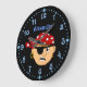 This fun custom wall clock is perfect for your favorite pirate boy. It has a boy pirate in the center. He's wearing an eye patch, and a pirate red bandanna.