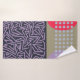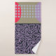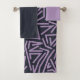 This towel set has a lavender washcloth, a navy hand towel, and a bath towel with a mid-century modern abstract design with three different backgrounds, zigzag lines, ovals, and circles, in navy, light blue, red, khaki, and lavender. If you want the same design with different colors, message me.