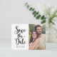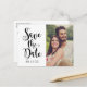 Striking and modern, this save the date postcard features a clean portrait split layout with large stacked black brush script typography on the left alongside a bold couple photo panel on the right. The couple's names and date are displayed in clean sans-serif beneath the script. The mailable postcard reverse includes all key details. All text and the photo are fully customizable.