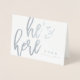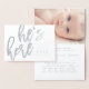 SCRIPT FONT HE'S HERE BIRTH ANNOUNCEMENT CARD.
