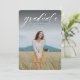 A simple classic script "graduate" in white accentuates a single vertical photo of your grad. This graduation announcement works for both college or high school graduates and is simple enough to let your photo shine. It's a timeless design and also features a striped backer with a customizable color (default is blue). The words are at the top of the photo but the design is also available with the words at the bottom.
