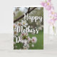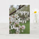 This card features a soft spring scene with a textured brown branch stretching diagonally across the upper area, dotted with small buds and clusters of white blossoms lightly brushed with pale pink. Centered over the florals, the words “Happy Mother’s Day” appear in white lettering that stands out clearly against the blurred background. A few blooms sit in sharp focus near the foreground, while others fade into a creamy, out-of-focus haze that feels like a gentle embrace ❤️. The background is a smooth blend of muted greens and milky whites, suggesting an early garden morning with light filtering through leaves. Golden-yellow centers glow within the flowers, adding a sunny touch 🌼 without overpowering the calm palette. The overall layout keeps the text in the middle while the branch frames it from above, creating a quiet, affectionate closeness between message and nature. Near the top, the branch’s buds and blossoms form a soft canopy, with the green bokeh fading deeper toward the edges.