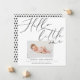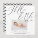 Hello little one modern 1 photo birth announcement. Elegant wonder script typography design text, modern printed photo effect. Black white monochrome polka bot backer design.