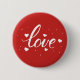 Simple white script "love", with drawn hearts and dots on red, pin back button.