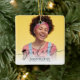 Modern Script Photo Graduation Ceramic Ornament features your graduate's photo and calligraphy script word, Graduate with a graduation cap. Personalize with your grad's name, school and class year for a unique graduation keepsake gift for high school grads or college university grads.