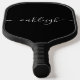 A modern minimalist pickleball paddle design featuring a white script and sans serif typography, on a black background.