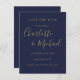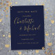Featuring signature style names, this elegant navy blue and gold save-the-date card can be personalized with your special wedding day information in chic lettering. Designed by Thisisnotme©