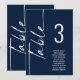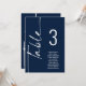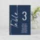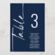 Script Navy White Table Number Names Seating Chart. Edit you number for each table and add to your cart separately. Same design is on both sides, use for a hanging display so guests can find their seat or on each table. In classic navy blue with white writing. Easily personalise the table number and your guest names. The same design is on both sides and will update simultaneously as you change the words to your own.