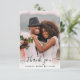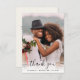 Elegant wedding thank you card featuring "thank you" in a chic script with swashes overlaying your wedding day photo and your first names and wedding date joined with a heart. On the back, personalize your thank you message and add your names in a signature-like script on a light cream background.